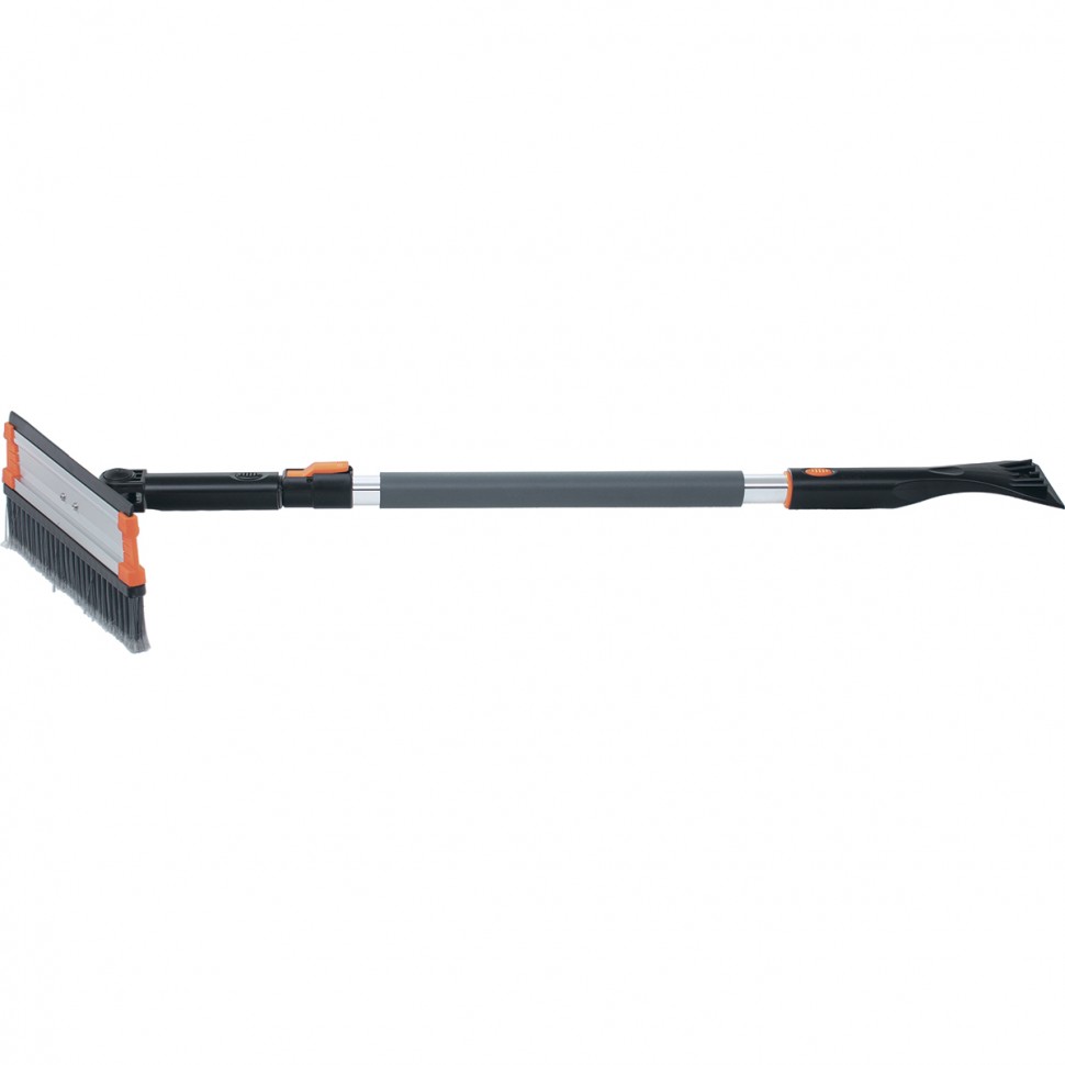 Телескопическая щетка-сметка для снега Stels 55299 со скребком и водосгоном, с поворотной головой, используется для очищения автомобиля от снега, наледи и воды. Благодаря рабочей части длиной 240 мм с плотной распушенной щетиной щетка для авто эффективно и аккуратно удаляет слой снега с кузова, не царапая его. Скребок для автомобиля шириной 250 мм быстро удаляет наледь, а зубья дробят толстую корку льда. Автомобильная телескопическая щетка для снега со скребком пригодится владельцам автомашин. Преимущества Благодаря раздвижной рукоятке телескопическая сметка позволяет легко очистить капот или крышу машины. Рукоятку автощетки для снега можно зафиксировать на выбранной длине для удобства работы. Голова имеет металлическое основание, а рукоятка изготовлена из алюминиевого сплава, что обеспечивает прочность телескопического стеклоочистителя. Поворотная голова телескопической щетки для автомобиля от снега фиксируется в одном из 5 положений, что облегчает очистку труднодоступных участков. У телескопической щетки-скребка имеется мягкий водосгон, эффективно очищающий стекла от воды и подтаявшего снега.