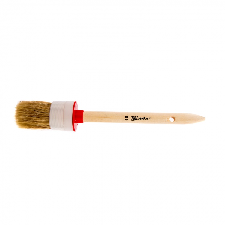 Круглая кисть MTX №10 (40 мм) 82080 с натуральной щетиной и деревянной ручкой пригодится в быту для окрашивания узких длинных поверхностей. Светлая натуральная свиная щетина с добавлением искусственной обладает высокой износоустойчивостью и может использоваться для нанесения красок с содержанием растворителей, а также масляных красок и лаков.