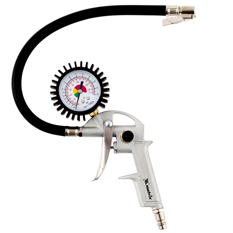 Пневматический пистолет Matrix 57322 с рабочим давлением 8 бар и производительностью 230 л/мин применяется для подкачивания сжатым воздухом автомобильных шин. Подходит для использования в гаражах, шиномонтажных мастерских и автосервисах. Механический манометр обеспечивает визуальный контроль давления, а спускной клапан позволяет стравливать воздух в случае перекачки шин, защищая их от преждевременного износа. Преимущества: 2 шкалы на манометре (Пси и Бар) позволяют контролировать и настраивать параметры давления. Простое управление — даже начинающий мастер быстро разберется, как работать с пистолетом. Удобный рычаг позволяет подавать воздух в шины как быстро, так и дозированно. Качество сборки — прочный корпус и герметичные соединения обеспечивают долговечность пневмопистолета и высокую эффективность работы без утечек воздуха. Гибкий шланг входит в комплект поставки. Он не твердеет на морозе, обеспечивает легкую подкачку даже спаренных колес. Быстросъемное соединение Рапид (Euro) позволяет сэкономить время на подключение пневмопистолета к компрессору. Пневмопистолет весит всего 250 г, хорошо ложится в руку, поэтому работать с ним