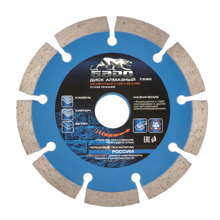 Сегментный алмазный диск Барс ф125х22,2 мм 73062 для сухого резания устанавливается в качестве оснастки на УШМ и штроборезы с соответствующим посадочным диаметром. Он пригодится домашним мастерам и профессионалам для сухой резки камня, кирпича, бетона и гранита, позволит быстро справиться с большим объемом работ.