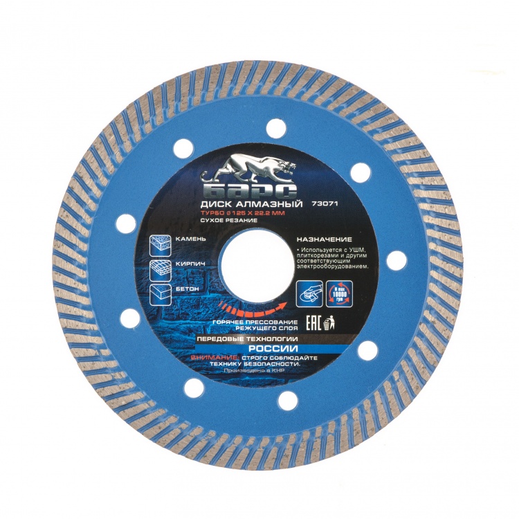 Алмазный диск Барс Турбо ф125х22,2 мм 73071 предназначен для сухого резания бетона, в т.ч. свежего, среднеармированного железобетона, камня, кирпича, гранита и песчаника. Его можно использовать с УШМ с посадочным диаметром 22,2 мм при проведении строительных и ремонтных работ.