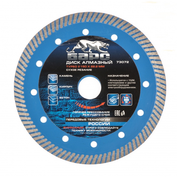 Алмазный диск Барс Турбо ф150х22,2 мм 73072 предназначен для сухого резания бетона, в т.ч. свежего, среднеармированного железобетона, камня, кирпича, гранита и песчаника. Его можно использовать с УШМ с посадочным диаметром 22,2 мм при проведении строительных и ремонтных работ.