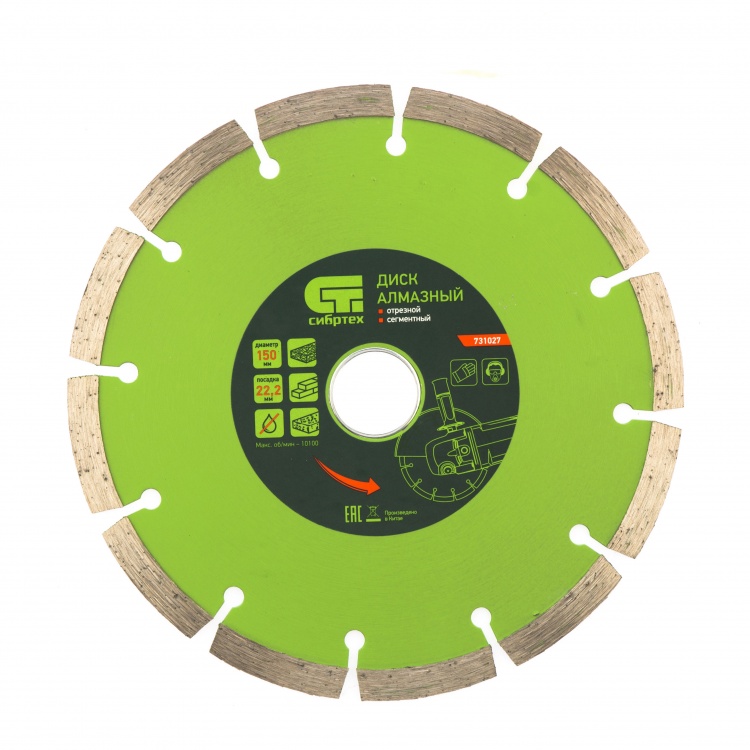 Диск алмазный отрезной сегментный Сибртех 731027, 150 х 22,2 мм, применяется для сухой резки бетона, камня, шлакоблока, тротуарной плитки и кирпича. Устанавливается на углошлифовальные машины с посадочным диаметром 22,2 мм. Оптимален для решения бытовых задач. Благодаря высокому рабочему ресурсу диск подходит для интенсивной работы.