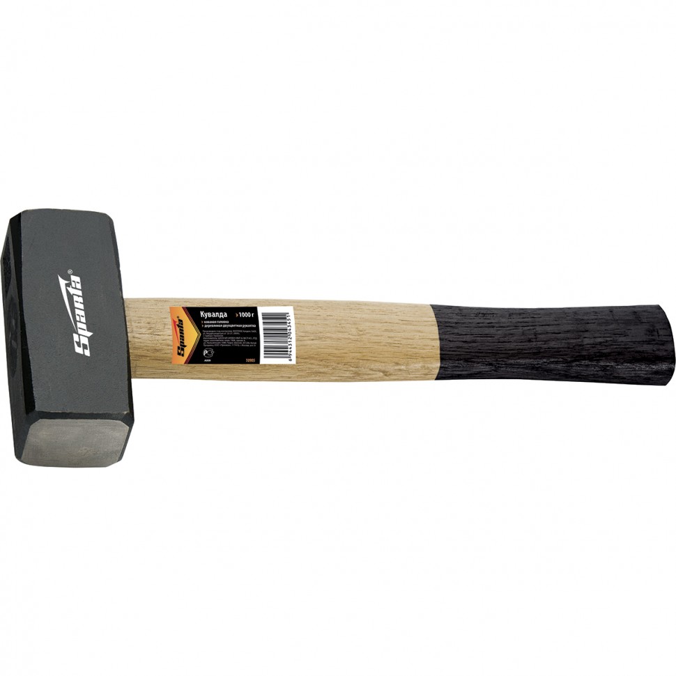 Кувалда Sparta 10905, длиной 280 мм, с бойком весом 1000 г, кованой головкой и деревянной двухцветной рукояткой, - ударный инструмент, которым можно наносить аккуратные контролируемые удары, чтобы выправить форму детали, забить большой гвоздь или скобу. Слегка выпуклый боек изготовлен методом ковки и отшлифован с двух сторон, поэтому отличается надежностью. Кувалда используется в быту при проведении строительных работ и для ремонта автомобилей.ПреимуществаМатериал бойка - среднеуглеродистая сталь 45, закаленная токами высокой частоты до твердости 40-45 HRC, которая имеет достаточную прочность, не расколется и не расплющится при ударе о металл.Ударные поверхности имеют грани со снятыми фасками, что предотвращает откалывание мелких частиц во время работы.Голова кувалды покрыта черным лаком, что защищает ее от ржавчины и продлевает срок службы инструмента.Рукоятка расклинена в голове и залита смолой, поэтому боек не слетит при ударе.Деревянная рукоять не скользит в руке, а лакировка защищает ее от рассыхания.