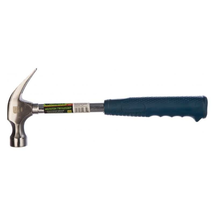 Молоток-гвоздодер Сибртех 10436 длиной 315 мм, с головкой весом 450 г и размером бойка 27 мм, с металлической трубчатой обрезиненной рукояткой, предназначен для проведения монтажных и демонтажных работ. Им удобно забивать крепежные элементы, кроме того, инструмент позволяет выпрямить загнувшийся гвоздь. Молоток полезен на стройплощадке, при сборке мебели, во время отделочных работ, пригодится также для использования в домашних условиях.ПреимуществаГоловка изготовлена из среднеуглеродистой стали 45, поэтому очень прочна и устойчива к деформациям.Твердость рабочих частей составляет 45-55 HRC, что обеспечивает износостойкость молотка.Металлическая трубчатая рукоятка устойчива к повреждениям в случае промаха по гвоздю, а также обеспечивает прочность инструмента на изгиб.Головка покрыта бесцветным лаком, защищающим ее от образования коррозии.Ручка имеет эргономичную форму, а покрытие из высококачественной терморезины предотвращает проскальзывание в руке.