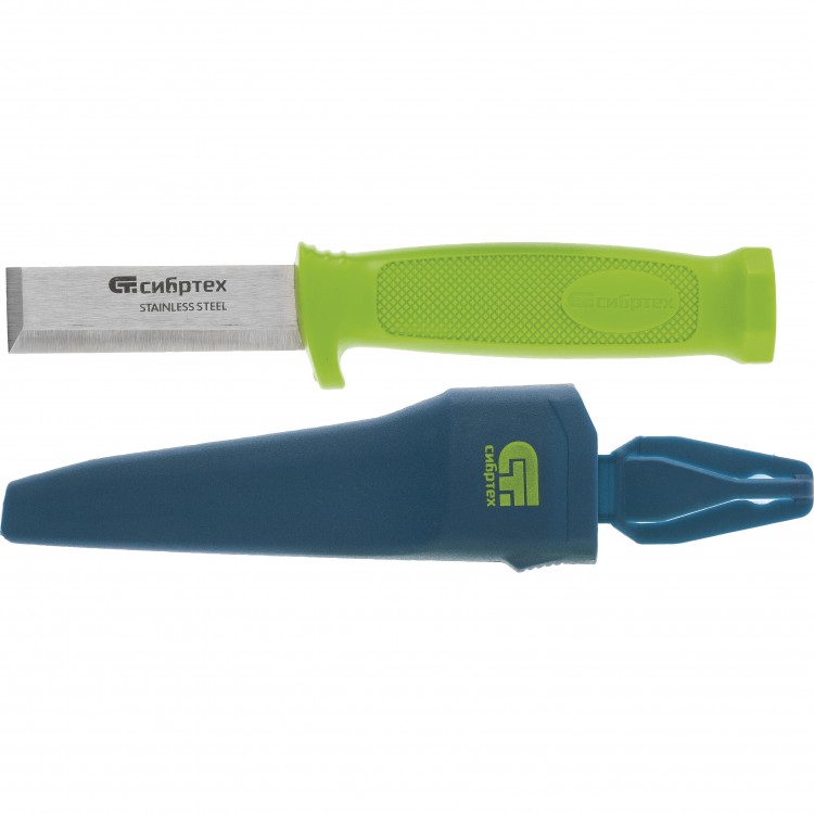 Нож-стамеска Сибртех общей длиной 195 мм и длиной лезвия 75 мм, с чехлом, пригодится в ходе проведения отделочных работ. За счет продуманной формы его можно использовать для резки материалов, а также для выборки углублений, снятия фасок и т.д. Две режущих кромки значительно повышают эффективность работы.