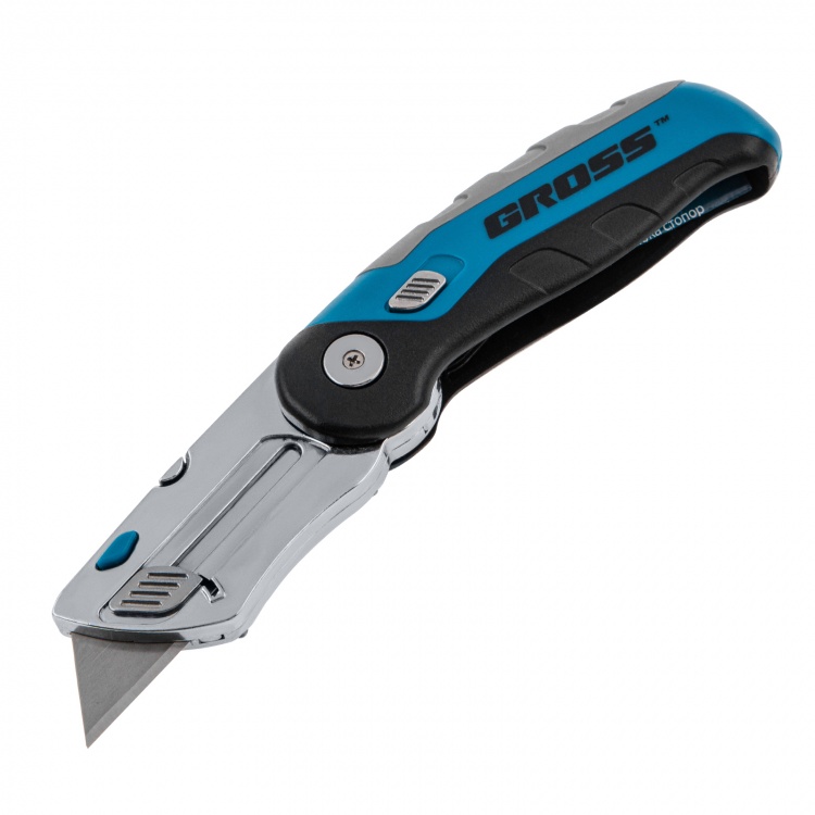 Складной ремонтно-монтажный нож Gross 78882 длиной 175 мм, с трехкомпонентной рукояткой, контейнером-держателем для лезвий и 2 запасными полотнами — режущий инструмент профессионального назначения. Используется для раскройки линолеума и обоев, разрезания картона, гипсокартона, кожи и других материалов. Нож защищен от самопроизвольного раскладывания — на боковой части имеется специальный стопор, фиксирующий держатель лезвия внутри корпуса.ПреимуществаИзносостойкость — лезвие из высокопрочной японской стали SK-2 толщиной 0,6 мм долго сохраняет режущие свойства.Высокий ресурс — трапециевидное лезвие служит долго, т.к. при износе его можно перевернуть другой стороной и продолжать работу.Быстрая замена лезвий — для извлечения старого полотна достаточно нажать на специально предусмотренную кнопку.Удобное хранение расходников — запасные полотна размещаются внутри держателя (кассета предусмотрена кассета для 2 лезвий).Расходники в комплекте — к ножу прилагается 2 запасных лезвия, и их не нужно приобретать отдельно.Комфортная работа — нож не выскальзывает из ладони благодаря эргономичной трехкомпонентной рукоятке с рельефной поверхностью.