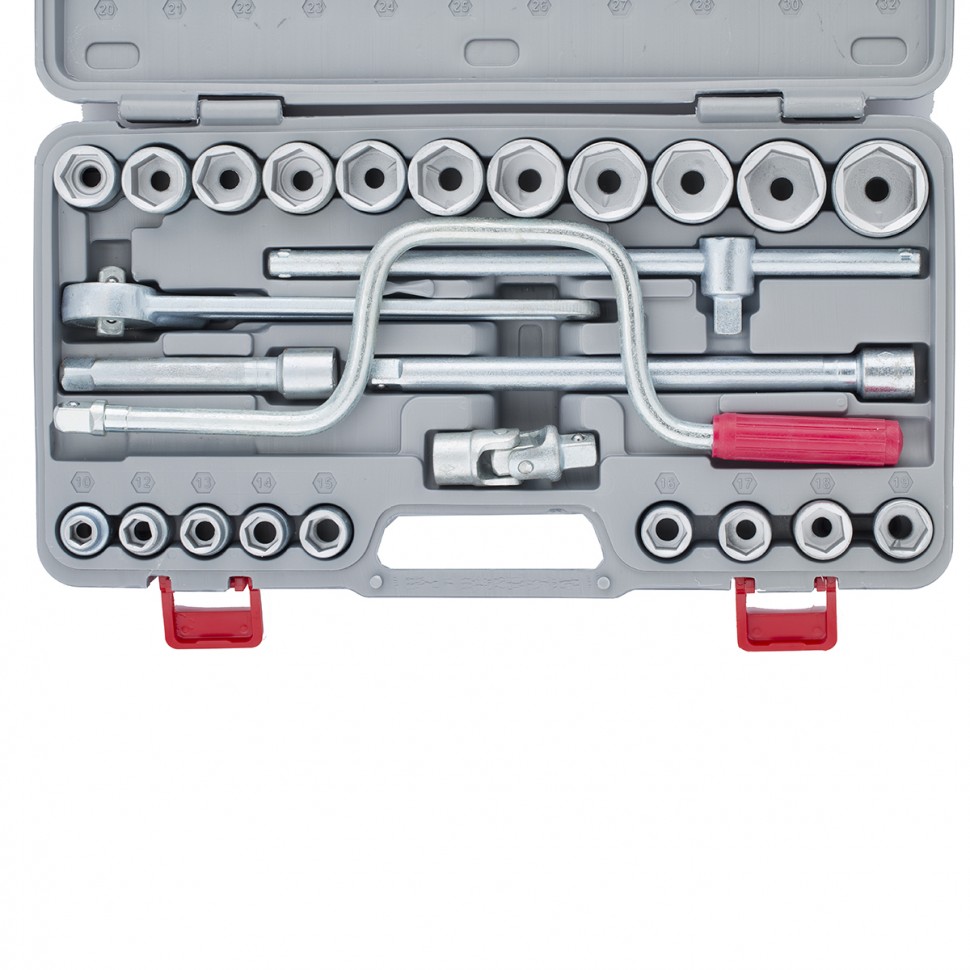 Набор шоферского инструмента № 4 НИЗ 13454 в пластиковом боксе пригодится автомобилистам для технического обслуживания и ремонта машин. Он содержит 20 торцевых головок типоразмеров 10, 12-28, 30 и 32 мм для монтажа крепежных элементов, трещотку для их зажима, удлинители и коловорот для работы в труднодоступных местах, шарнир и ключ с присоединительным квадратом.ПреимуществаПрочность и долговечность — все инструменты изготовлены из конструкционной легированной стали 40Х и оцинкованы для предотвращения коррозии.Быстрое переключение между задачами — трещоточный ключ с функцией реверса позволяет как закручивать, так и откручивать болты и гайки.Коловорот в комплекте — можно открутить даже прикипевшие крепежи.Возможность работы в ограниченном пространстве — удлинители 125 и 250 мм, а также карданный шарнир позволяют откручивать крепеж под любым углом.Надежная фиксация насадок — ключ с присоединительным квадратом оснащен металлическим шариком.Удобное хранение и транспортировка — набор поставляется в пластиковом боксе с подписанными номерами торцевых головок.