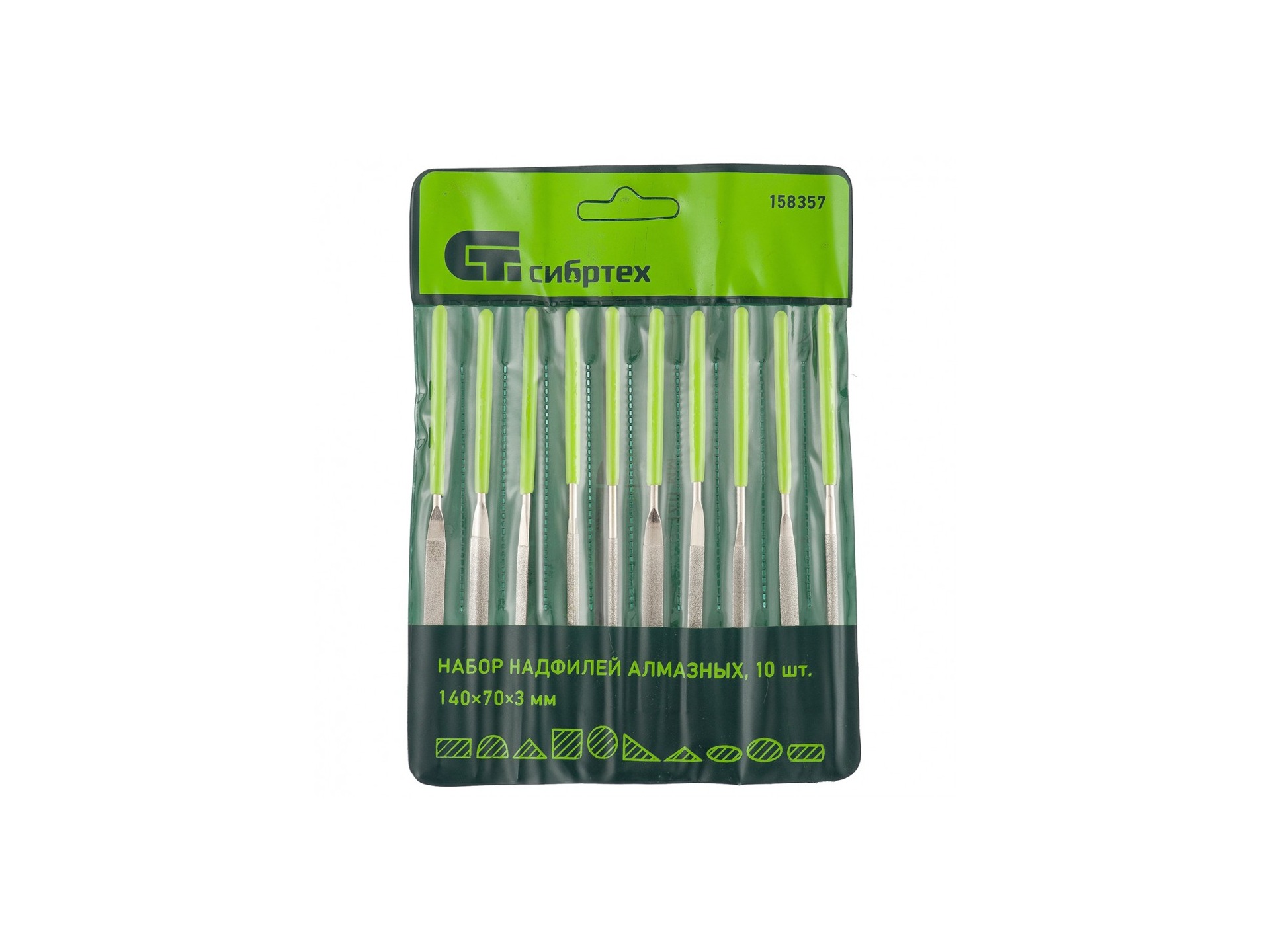 Набор алмазных надфилей Сибртех 158357 из 10 шт., 140 х 70 х 3 мм, предназначен для опиливания твердых поверхностей — стекла, металла, камня, керамики. В комплекте надфили с самыми распространенными профилями, благодаря чему можно обрабатывать плоские детали, пазы, углы, отверстия, сложные грани и рельефные поверхности. Набор будет полезен при проведении слесарных или ремонтно-отделочных работ, пригодится и в быту.ПреимуществаАлмазная крошка, являющаяся абразивом, характеризуется высокой твердостью, что увеличивает ресурс надфилей.Обрезиненные рукоятки не выскальзывают из ладони, что обеспечивает комфорт во время работы.Надфили с яркими рукоятками хорошо заметны среди других инструментов, поэтому не затеряются в рабочем пространстве.