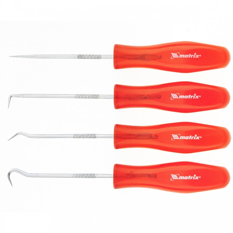 Набор крюков для слесарных работ Matrix 11761 состоит из 4 предметов длиной 155 мм — шила, полного и углового крюков, а также крюка на 90 градусов. Набор позволяет решать разнообразные бытовые и профессиональные задачи: снимать уплотнительные кольца и сальники, размечать металлические детали, проделывать отверстия в коже, дереве и других материалах. Инструменты будут полезны при выполнении строительных, слесарных и столярных работ, пригодятся в автосервисе, а также дома или на даче.ПреимуществаСтержни выполнены из прочной стали, а значит, они не погнутся и не сломаются в ходе эксплуатации.Хромированное покрытие защищает инструменты от коррозии и продлевает срок их службы.Рукоятки изготовлены из прочного пластика и плотно лежат в руке, обеспечивая комфорт и снижая усталость во время работы.